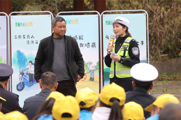 此次活动以群众喜闻乐见的“坝坝会”形式开展,黔南民族师范学院副教授、平塘县卡蒲乡新关村驻村第一书记、平塘县交通安全公益宣讲人裴会敏用通俗易懂的语言宣讲农村交通安全出行,倡导广大农民朋友关注交通安全,自觉遵守交通法规,抵制交通违法,摒弃交通陋习。平塘县公安交通管理局车管所民警对报名参加摩托车考试的群众进行考前培训,详细讲解摩托车考试的流程和注意事项。省公安厅交通管理局宣传处王佳老师就农村交通安全话题开展有奖竞答,现场群众积极参与互动,在与父老乡亲们互动交流中,“知危险 会避险”的交通安全理念更加深入人心。活动现场,乡亲们唱起毛南山歌。“平安出行第一条,交通安全要记牢。一盔一带心中记,安全骑车排第一……”一条条交通安全警句从歌声中流淌出来,荡漾在风情园的上空。在主持人王佳的带领下,现场干部群众、学生代表一起宣读交通安全倡议书,引发大家对交通安全的共鸣。