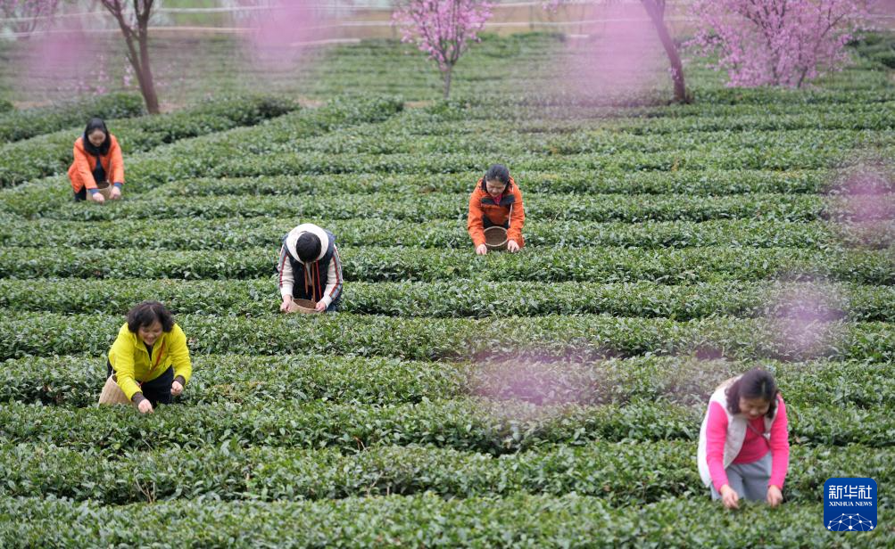 3月16日,茶农和体验采茶的游客在贵州省凤冈县永安镇田坝社区生态茶园基地采摘春茶。新华社记者 杨楹 摄