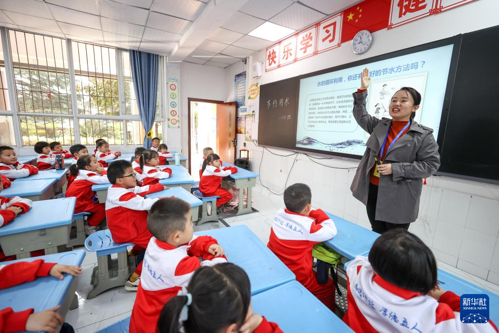 3月22日,贵州省毕节市实验学校教师在“节约用水”主题班会上为学生讲解节水知识。