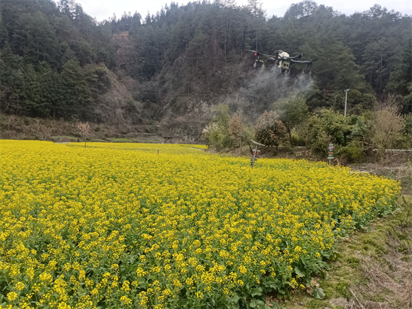 在郎德镇上郎德村作业现场,站满了赶来看“小飞机”的村民。只见飞防技术人员操作熟练,有条不紊地完成了配药、装药等程序后,伴随着“嗡嗡”的旋翼转动声,带药液的植保无人机开始了匀速飞行,喷杆均匀地向下喷洒着雾状药液,100亩油菜很快就完成管护,整个过程快捷高效、省时省力。