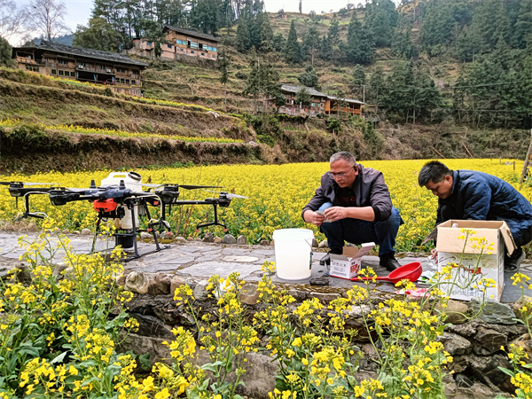 “我们开展油菜病虫害统防统治,主要是通过叶面喷施杀菌剂、杀虫剂及植物生长调节剂,加硼肥、磷酸二氢等叶面肥,有效预防了菌核病、霜霉病及蚜虫等病虫害,防止油菜花而不实和早衰,达到助产增收。”雷山县农业农村局农艺师杨俊说。