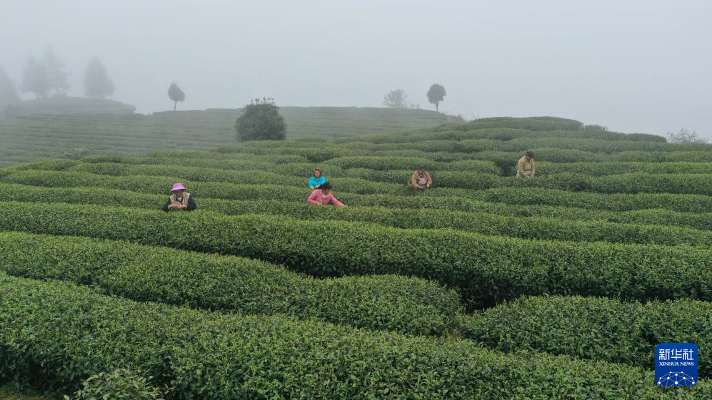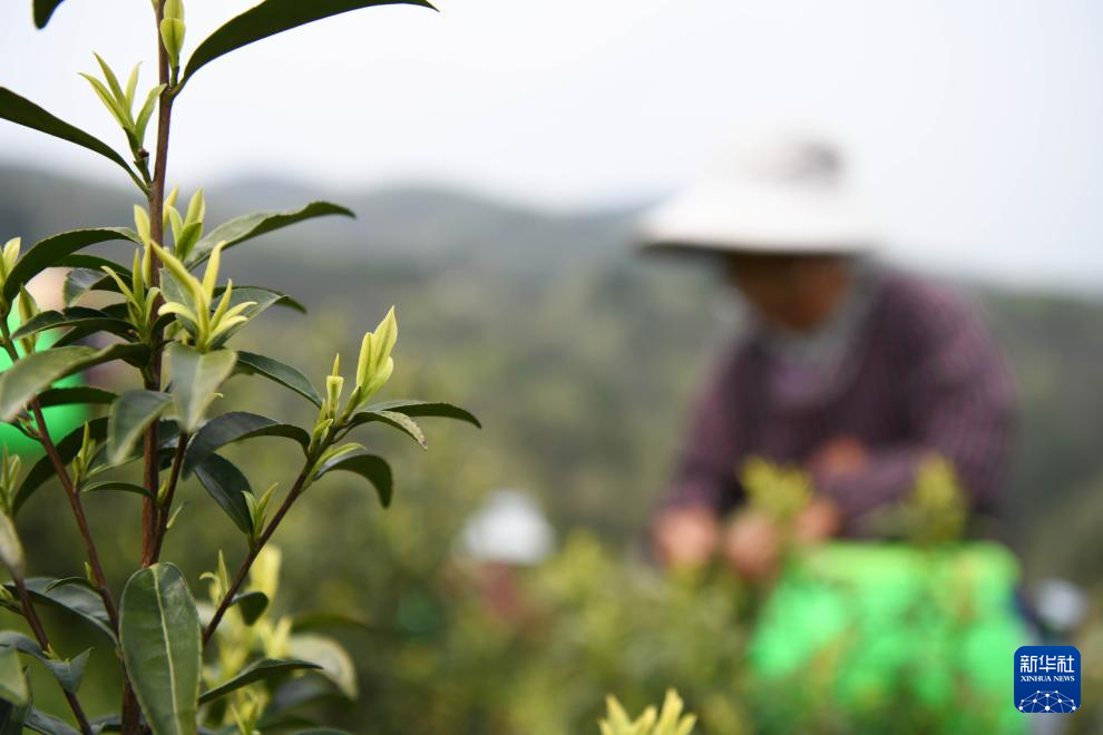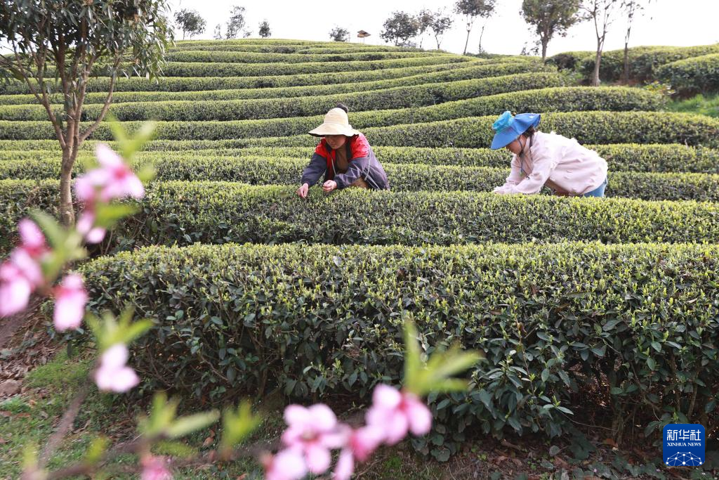 3月27日,村民在贵州省黔东南苗族侗族自治州黄平县新州镇白塘村采茶。新华社发(王超摄)