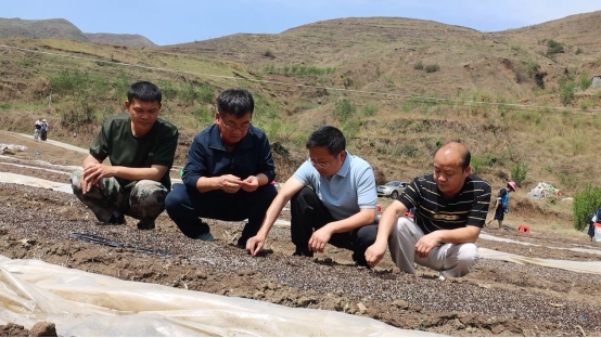 李刚(左二)和周远森(左三)在田坝村玉米育苗点开展工作。