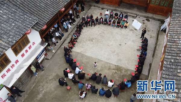 4月12日,“院坝协商”会在白垛村黑冲组举行(无人机照片)。新华网发(吴昌前摄)
