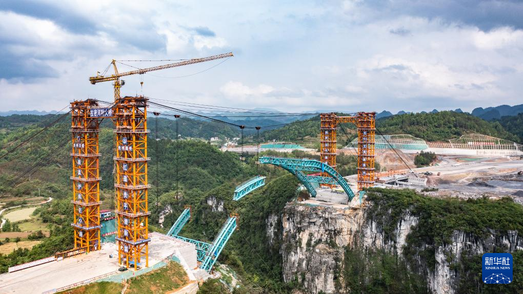 4月17日拍摄的建设中的贵平高速摆龙河大桥(无人机照片)。新华社记者 陶亮 摄