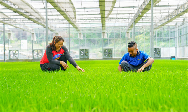 4月22日,在贵州省黔东南苗族侗族自治州榕江县车江坝区大棚水稻秧育苗基地,员工正查看水稻秧苗长势。