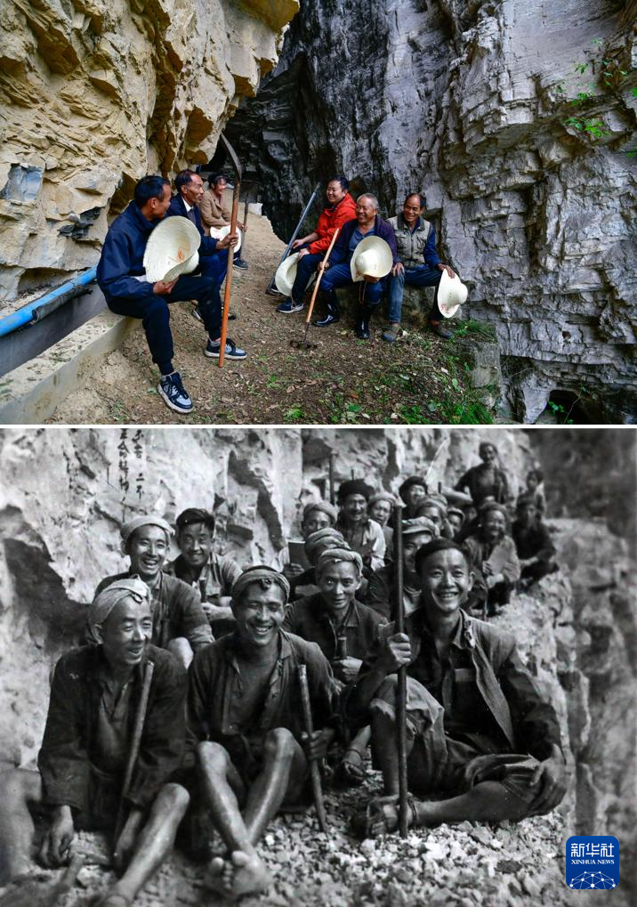 拼版照片:上图为4月24日,护渠队员在贵州省毕节市七星关区生机镇巡护高流天渠时留影(新华社记者 杨文斌 摄);下图为1960年,村民们在七星关区生机镇修凿绝壁天渠时的合影(王振翔 摄)。新华社发