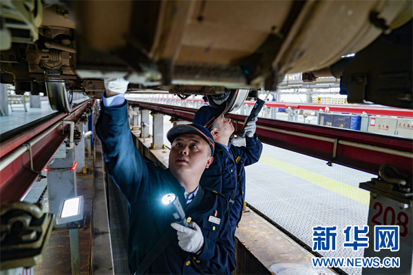 图为动车组机械师在进行动车组车底部件检查。新华网发(杨杰文摄)