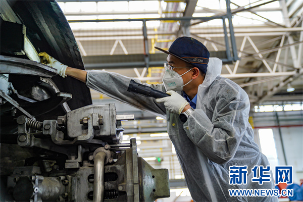 图为动车组机械师在检查动车组天线。新华网发(杨杰文 摄)