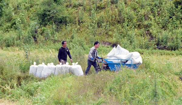 农技人员收割油菜籽进行打包封装。杨旭 摄