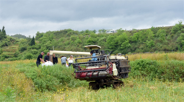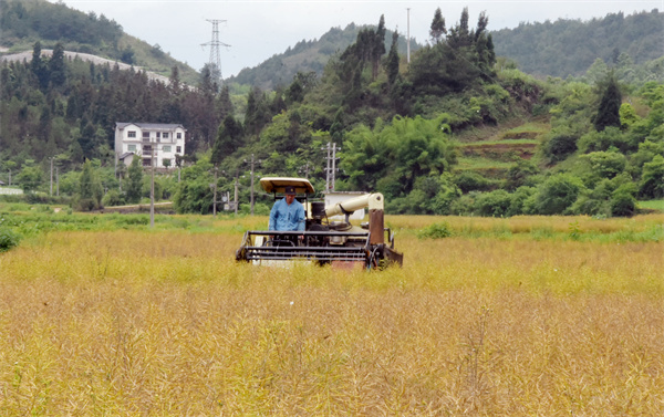 5月8日,施秉县城关镇新红村甘地坪坝区400余亩油菜陆续进入成熟期,村民采用现代化农业机械进行收割,颗粒归仓,保障丰产丰收。