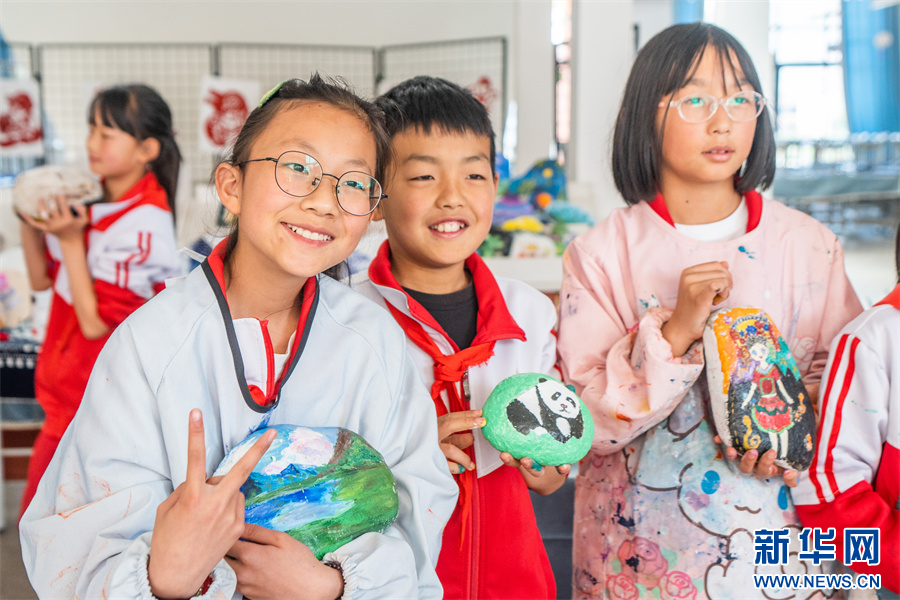 当日,贵州省毕节市威宁彝族回族苗族自治县第五小学的不少学生课后来到美术社团教室,拿出画笔、颜料,在石头上画出人物、熊猫、兔子、自然风光等图案,一块块普通的石头通过孩子们的精巧设计和描绘,被赋予新的“生命”。除在石头上绘画外,学生们还将自己的创意挥洒在簸箕、纸伞、扇子上,将它们变成一幅幅独特多彩的美术作品。
