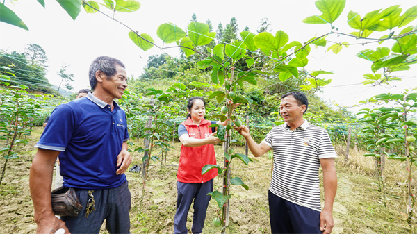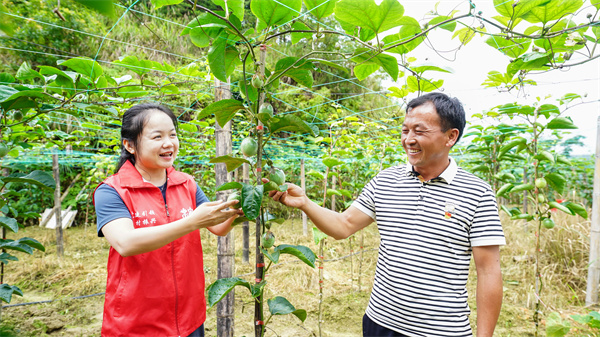 7月3日,在贵州省黔东南苗族侗族自治州榕江县崇义乡下咸村,党员正与村里干部群众查看百香果长势情况,指导如何加强田间日常管护。