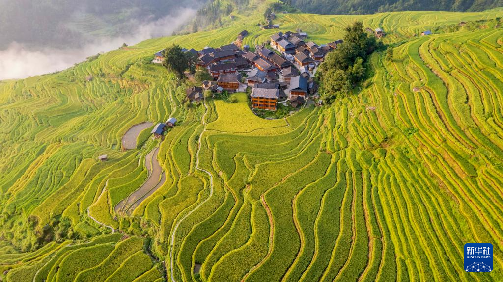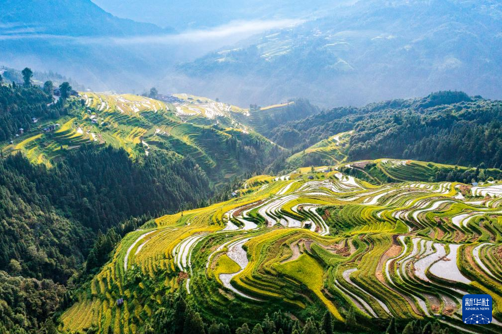 初秋时节,位于贵州省黔东南苗族侗族自治州从江县大山深处的加榜梯田水稻陆续成熟、线条分明。青山环抱着梯田,苗寨点缀其间,在不同光线下呈现出不同色彩,一幅幅秋日丰收图景在山间铺展开来。