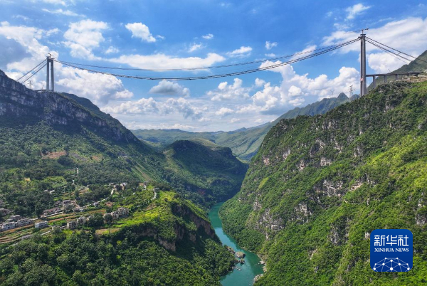 建设中的花江峡谷大桥(无人机照片,9月3日摄)。新华社记者 刘续 摄
