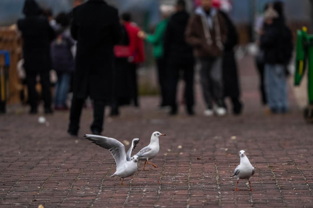 11月27日,游客在贵州草海国家级自然保护区投喂红嘴鸥。