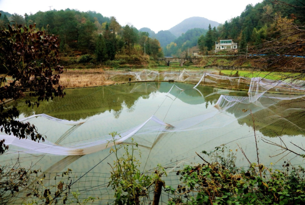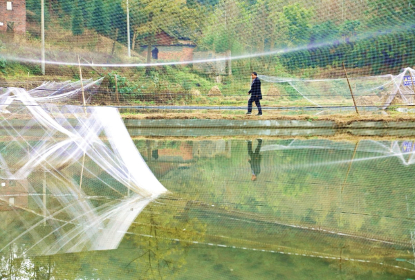 时值冬季,走进修文县小箐镇岩鹰山村新场坝组,山间盆地当中,一块块灌满水的稻田映入眼帘,明亮的水田上搭着薄薄的一层防鸟网,如纱如雾,此情此景,仿佛走进如诗如画的江南水乡。