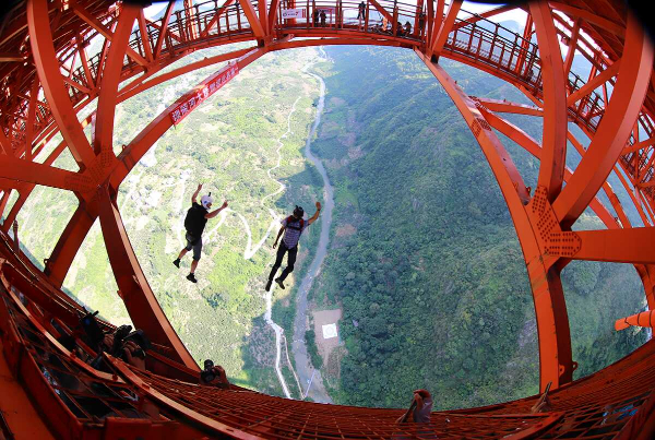 走进位于黄果树旅游区的坝陵河大桥,乘坐观光电梯向上,壮阔的景色骤然呈现,两岸青山耸立,峡谷深不见底,蜿蜒向两侧延伸。走到桥体中段,这座桥的奥秘才得以被探究——高空蹦极、低空跳伞、空中漫步、高空秋千等极限运动项目集聚在此,370米的高度足以激发每一个极限运动爱好者的挑战欲。