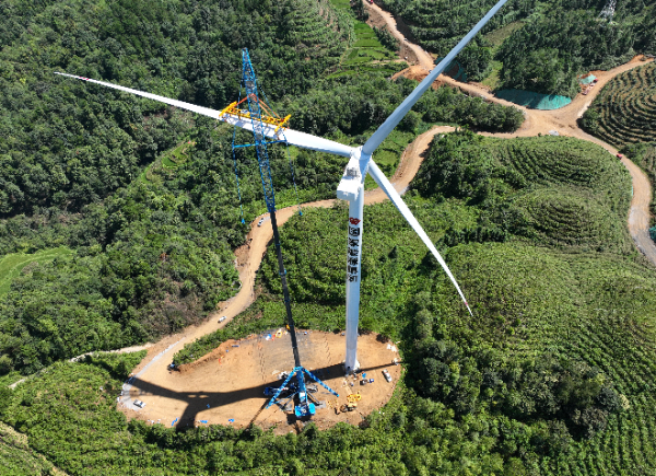 在镇宁自治县江龙镇风电场建设项目点上,已经投入使用的风力发电机正在不停转动扫风,每小时的发电量约为6250度。而另一座山头上,还未完成风机组装的施工现场热火朝天,施工人员正严格按照“高挂低用”的施工要求围坐在一旁,风机轮毂摆放在早已浇筑完成的电机基础边,等待着风机叶片、塔架等部件到达施工现场进行组装,为镇宁绿色能源发电提供新动力。
