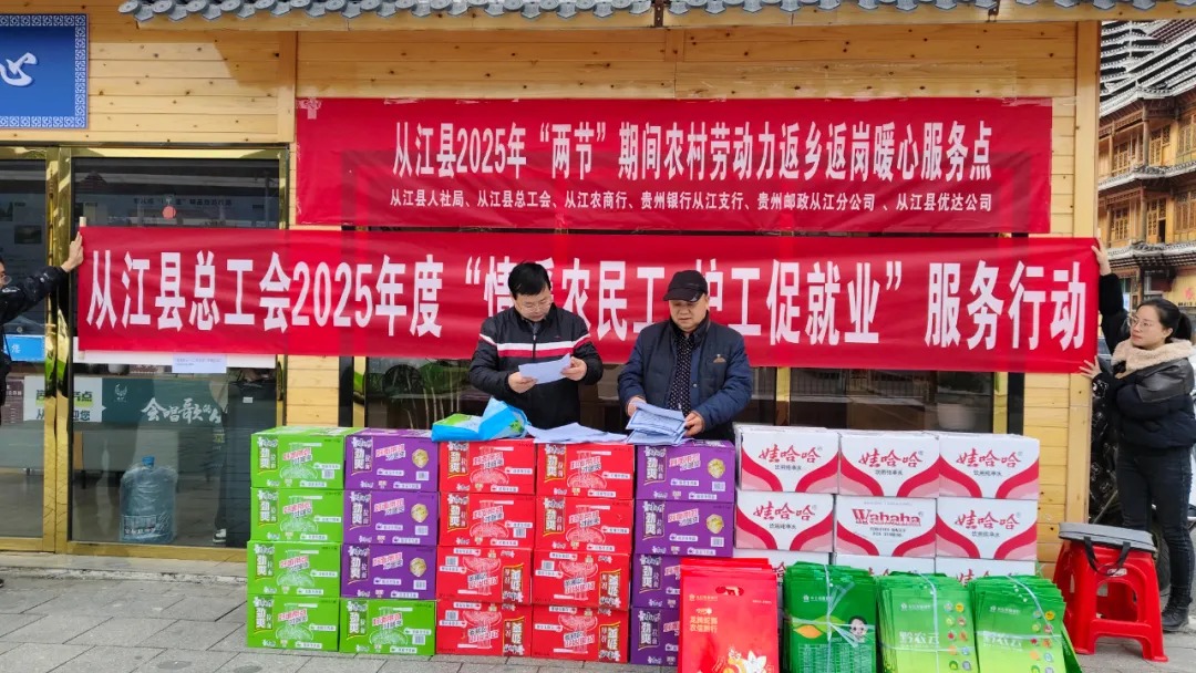 近日,在从江县2025年“两节”期间农村劳动力返乡返岗暖心服务点看到,工作人员一边为老乡们递上矿泉水和方便面,一边详细地宣传解答相关就业政策,为他们提供精准的就业指导和服务。