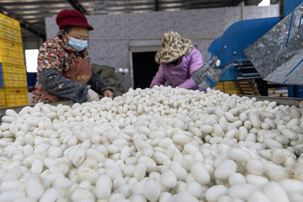 工人在贵州丝缘丝绸科技有限公司生产车间内开展选茧、煮茧、缫丝等作业。
