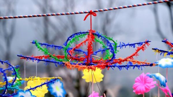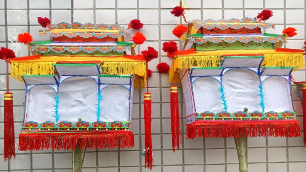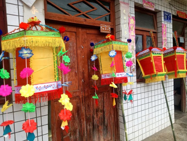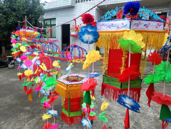 “花灯骨架扎好以后,过去是用白纸糊,假如你玩灯,竹竿稍微偏一点,就可能把白纸点燃,‘咻’的一下这个灯就完了;现在是拿绫纸糊,最多烧出一个小洞。以前是拿面浆来糊,现在是用胶水糊,胶水粘性好,你故意扯它都扯不掉。以前的吊花都是用白纸做,现在是从网上买,买来就穿到花灯上,既省事又还好看。”申时友说。