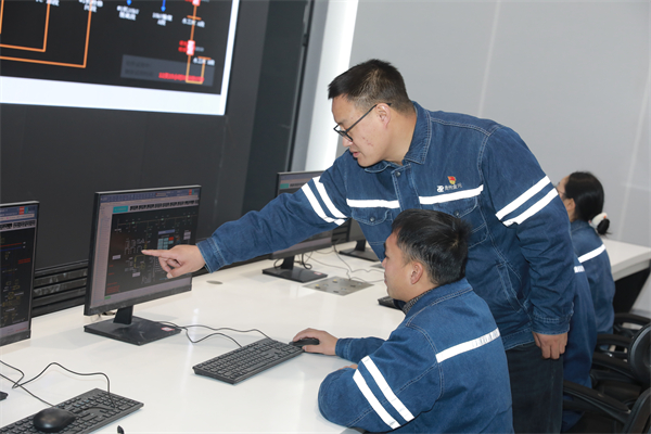苏郁在对电厂技术人员进行技术指导。陈再雄 摄
