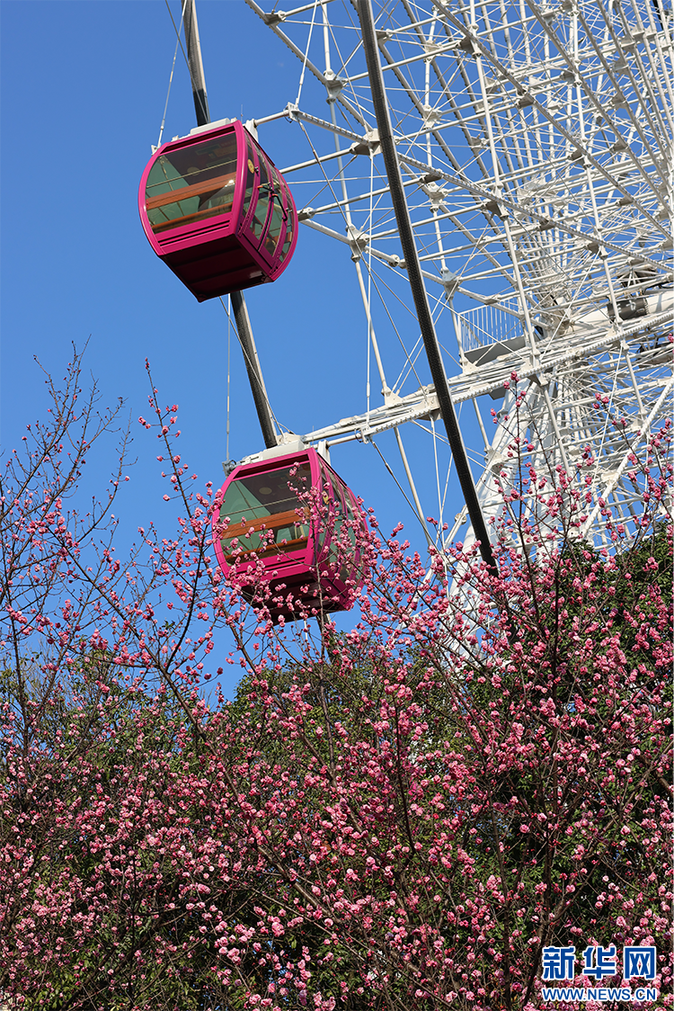 3月2日,贵阳河滨公园梅花盛开,与摩天轮相映成趣。新华网发(袁梦雨 摄)