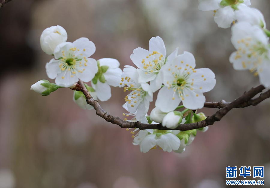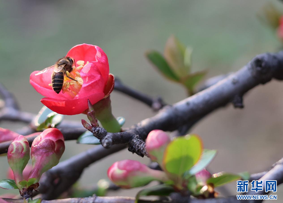 3月2日,贵阳河滨公园的海棠盛开,引来蜜蜂采蜜。新华网发(袁梦雨 摄)