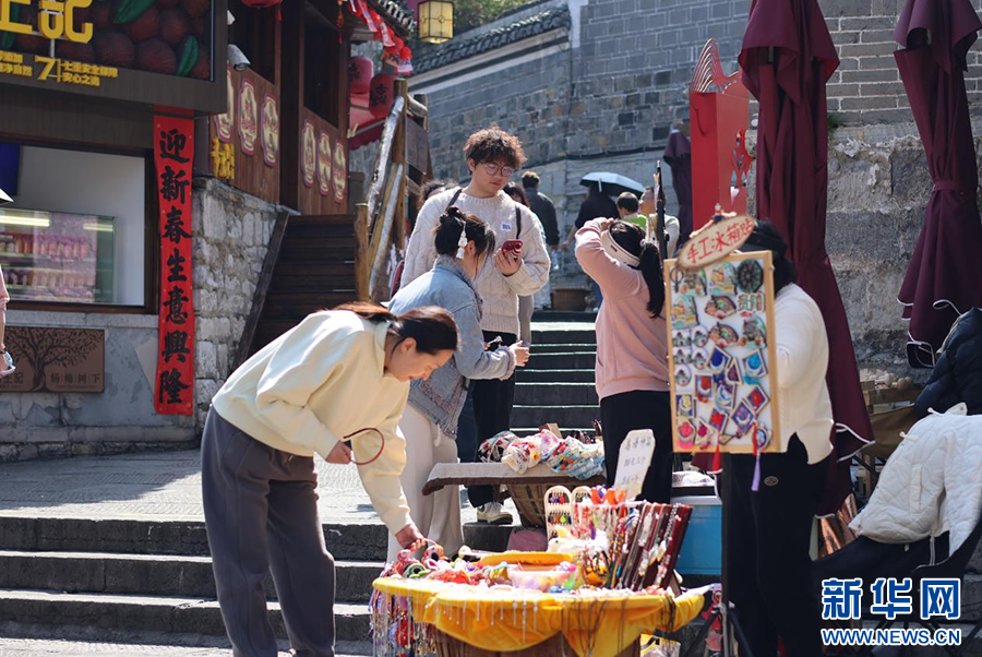 3月2日,贵阳青岩古镇游客正在选购商品。新华网发(袁梦雨 摄)