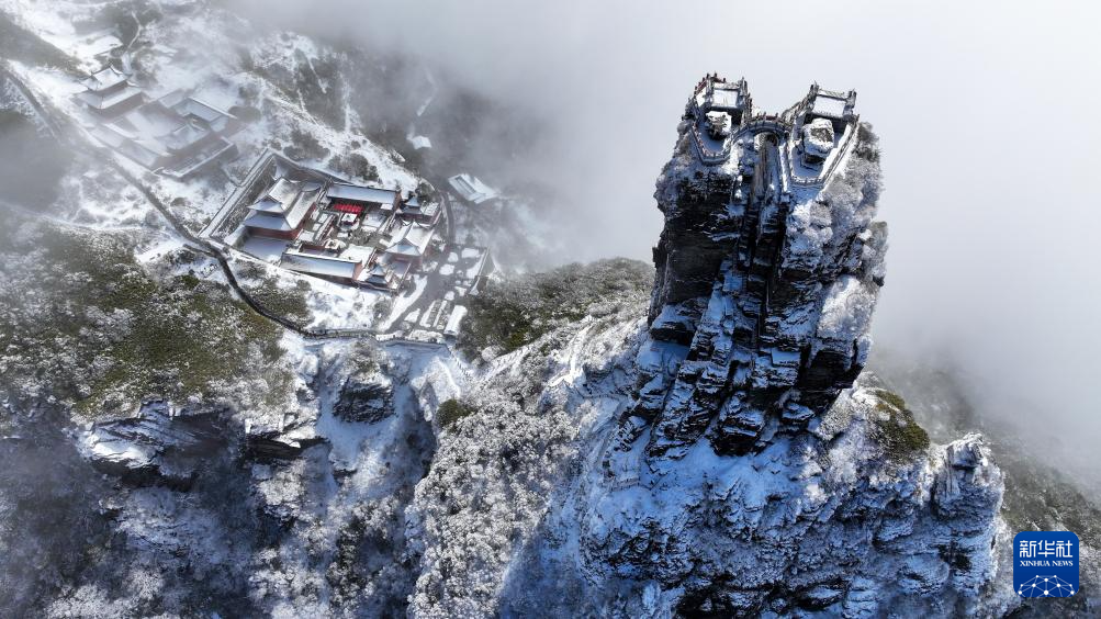 这是3月7日在贵州铜仁梵净山景区拍摄的春雪景观(无人机照片)。