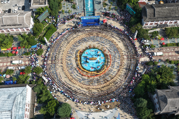 激昂的鼓点在广场中央擂响,如春雷乍响,似万马奔腾,瞬间点燃了整个县城的热情。舞者们以水鼓为中心,围成一圈圈“同心圆”,随着鼓点的节奏,翩翩起舞,旋转、翻越、甩手……动作豪迈有力,一脚踩出一串串水花,银铃叮咚响不绝。