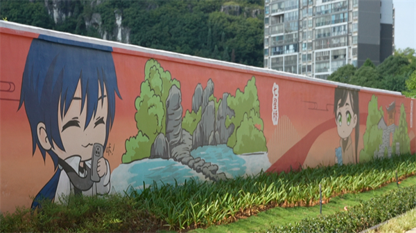 走进花山绿道,映入眼帘的是两侧郁郁葱葱的植被和精心打造的浮雕墙。墙面雕刻着屯堡面具、安顺蜡染等传统元素,展示着安顺独特的文化魅力;冲冲糕、牛肉粉等美食图案,让人垂涎欲滴;天龙屯堡、黄果树瀑布等安顺标志性山水人文景观,尽显家乡之美;工匠们用流畅的线条勾勒人物神态,用细腻的纹理还原生活场景,每一幅浮雕都仿佛在无声地诉说着这片土地的历史脉络与文化底蕴。