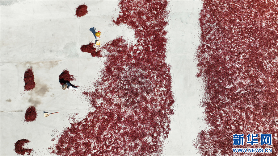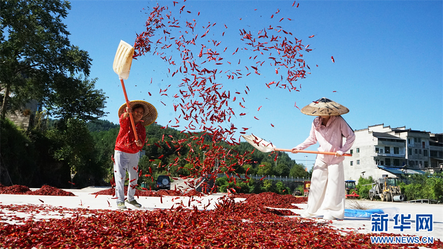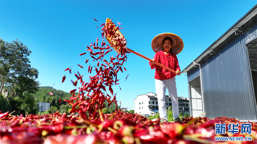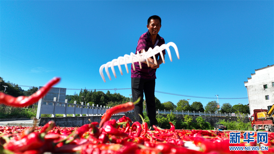 村民抢抓晴好天气晾晒辣椒(8月25日拍摄)。新华网发(钟勇 摄)