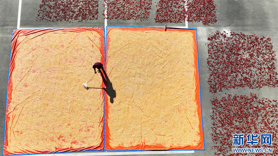 村民抢抓晴好天气晾晒玉米、辣椒(8月25日拍摄)。