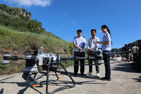 税务干部了解贵州迅航科技有限公司的大疆T100植保无人机作业情况。(童霖 摄)