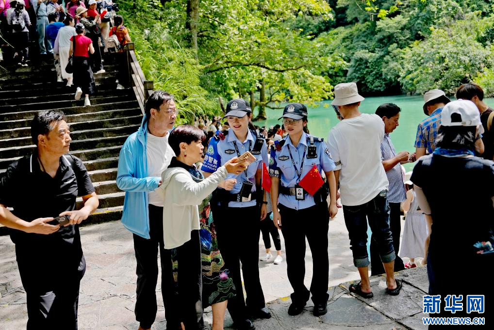 新华网贵阳9月26日电(记者 杨欣)国庆假期将至,贵州省黔南州荔波县樟江景区内游客渐增,荔波县公安局樟江景区治安派出所旅游警察女子中队民警梁佳瑶穿行在翠绿的山水间,忙着处理游客的各种求助。虽已入秋,忙碌一天下来,汗珠依然浸湿了警服。