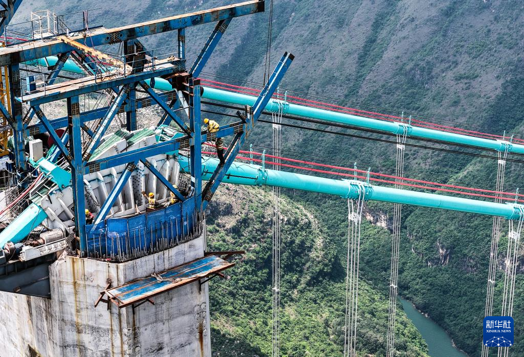 6月6日,工人在贵州花江峡谷大桥桥塔顶上施工(无人机照片)。新华社记者 杨文斌 摄