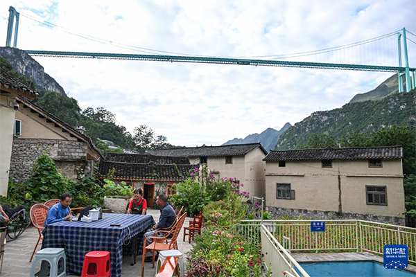 9月27日,在贵州省贞丰县平街乡花江村,返乡创业村民林国权(左)在“布依桥缘居”民宿里登记入住客人信息。新华社记者 杨文斌 摄