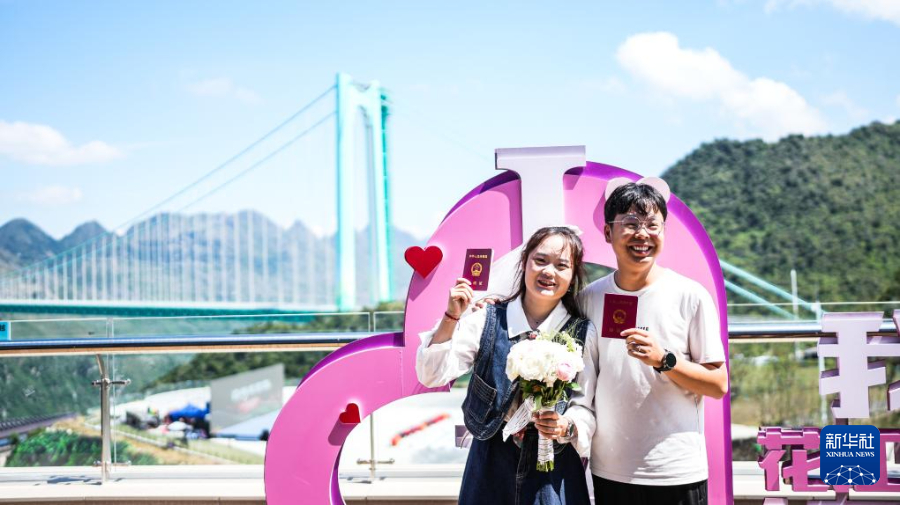 一对新人在贞丰县民政局花江峡谷大桥婚姻登记巡回点登记结婚(9月28日摄)。新华社记者 陶亮 摄