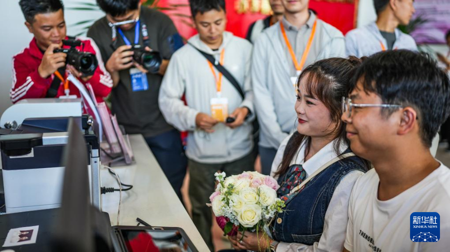 前来登记的新人在服务区露台合影留念(9月28日摄)。新华社记者 陶亮 摄