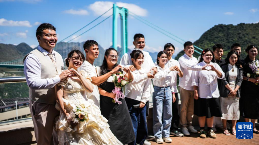 新人在花江峡谷大桥桥肚合影留念(9月28日摄)。新华社记者 陶亮 摄