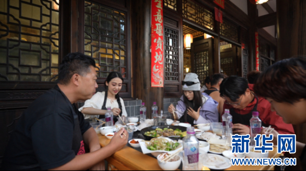 采风团在平远古镇品尝当地特色美食烙锅。新华网发(主办方供图)