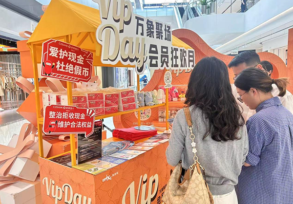 针对商圈人流量大、消费场景密集的特点,浙商银行贵阳分行在贵阳万象城、花果园财富广场等商圈设置宣传站点,通过“站点服务+流动宣讲”的模式,为消费者、商户及工作人员送上“零距离”金融安全课。宣传人员手持新版人民币折页,向过往消费者讲解“一转二摸三透光”的快速鉴别技巧,深入商场商铺,对收银台、服务台等人群密集区域开展“流动宣讲”,为商户员工重点讲解收付现金时的防伪要点。