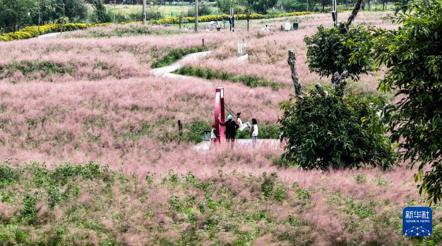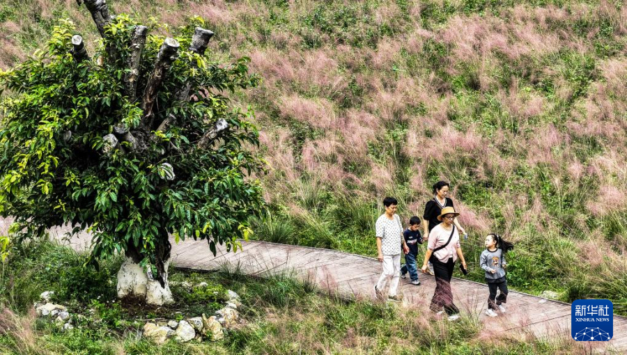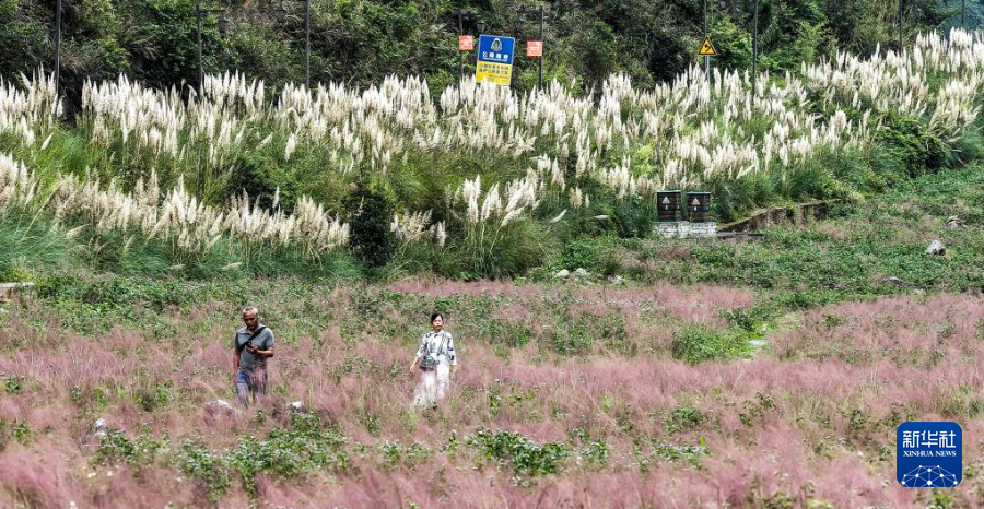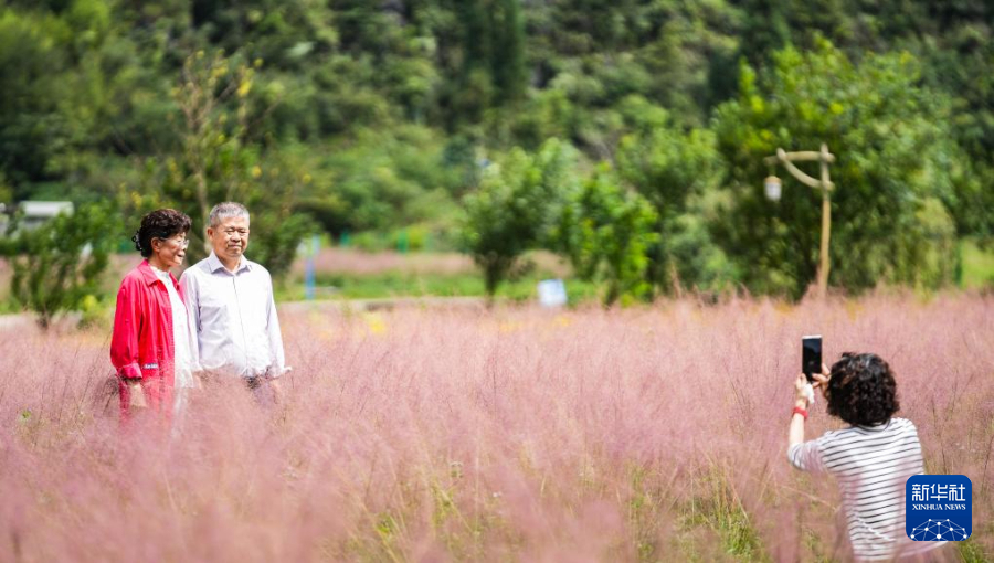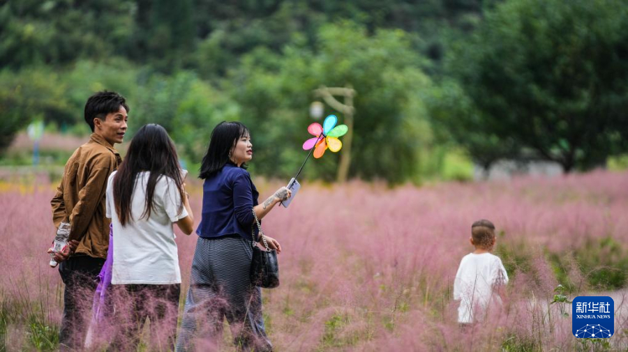 近日,贵州省黔南布依族苗族自治州长顺县神泉谷景区内的粉黛乱子草渐渐进入盛开期,成片的“粉色花海”吸引众多游客前来观赏游玩。