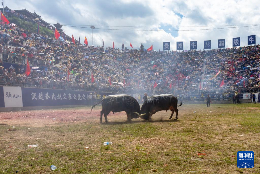 10月2日,观众在贵州省黔东南苗族侗族自治州从江县丙妹镇松学斗牛塘观看斗牛。新华社发(吴德军 摄)