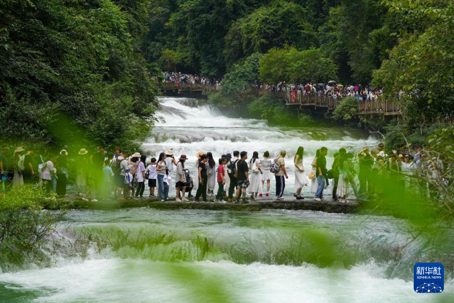 10月3日,人们在贵州省黔南布依族苗族自治州荔波县小七孔景区观光游玩。新华社发(龙建睿摄)