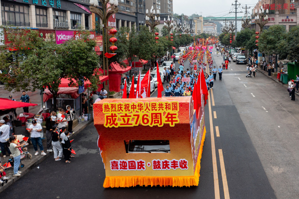 巡游中,各具特色的非遗项目轮番亮相。思州金钱棍队员手持彩棍,随着节奏上下翻飞,清脆节拍与雄浑鼓乐交织成一曲民俗交响;羊桥摆手舞代表队踏着铿锵的节奏,身姿如柳絮随风摆动,裙摆银光与现代街景共绘时空叠影;国旗方阵中,学生们手中的鲜红旗帜迎风猎猎,成为整条街道最耀眼的色彩,象征着家国情怀与文化自信的深度融合。