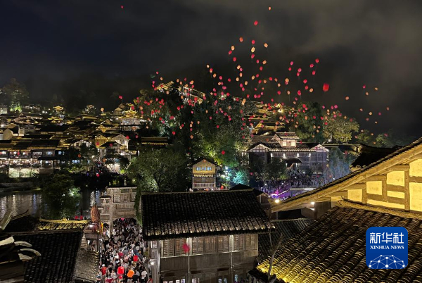 入夜,无人机阵列在空中排开,中秋无人机烟花秀开启。当“欢庆国庆”的字样在空中显现,风雨桥与吊脚楼里的游客纷纷举起手机拍摄。随着音乐流转,多彩焰火与无人机表演交织,在现代科技加持下,火树银花的盛景赢得阵阵赞叹。