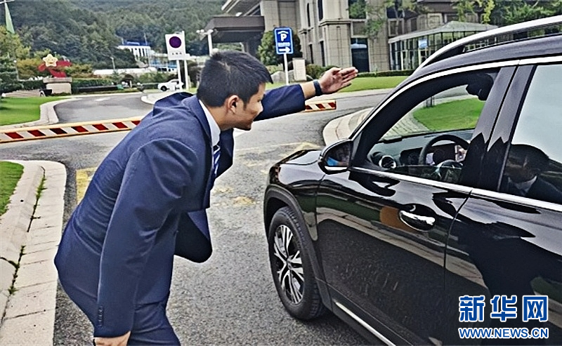 在遵义贵州饭店,身着制服的礼宾员以标准手势引导车辆,用微笑服务迎接每一位宾客。新华网发